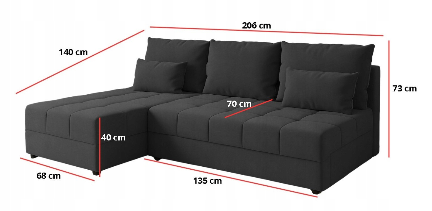 Narożnik z funkcją spania DOMINO L FIT dzięki szerokości 206 cm idealnie sprawdzi się w mniejszych mieszkaniach. Narożnik posiada trzy grube poduchy oparciowe oraz dwa małe jaśki. Pod siedziskiem znajduje się pojemnik na pościel i poduszki.