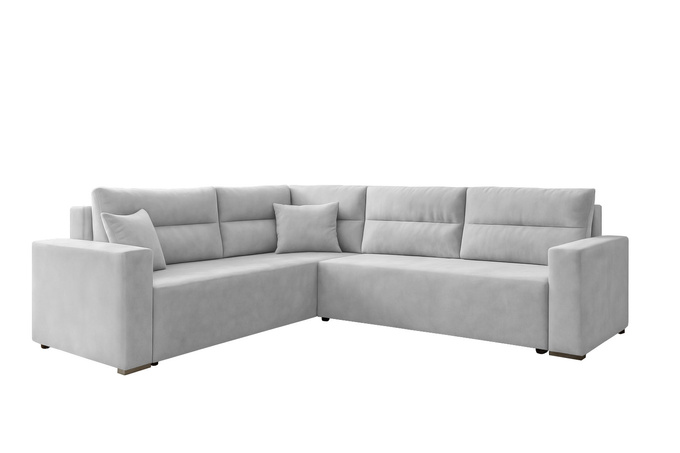 - Narożnik LUNO w kształcie litery L z funkcją spania i pojemnikiem na pościel. Tapicerowany tkaniną Kronos – aksamitną, hydrofobową i odporną na mechacenie. Uniwersalny montaż prawo/lewostronny, w zestawie poduszki typu „jasiek”.