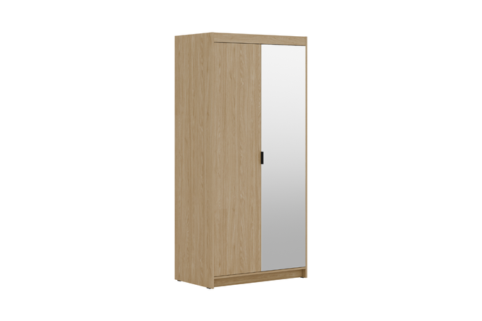 Front z dużym lustrem optycznie powiększa przestrzeń i dodaje wnętrzu lekkości. Dekor w odcieniu dąb olejowanym w połączeniu z czarnymi uchwytami nadaje meblowi elegancki i ponadczasowy charakter – idealny do wnętrz loftowych, klasycznych i nowoczesnych.