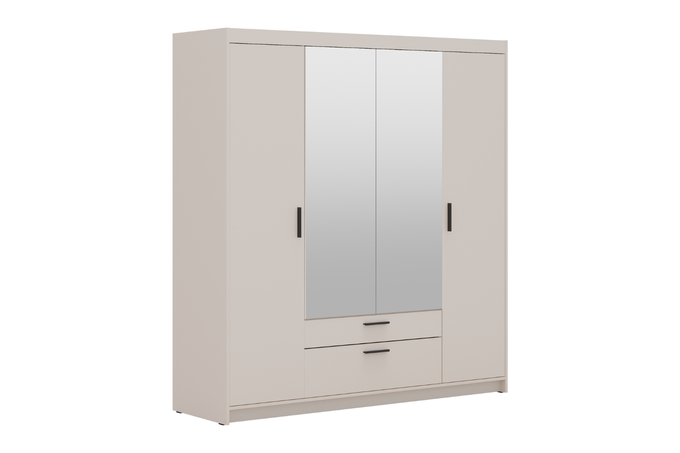Front z dużym lustrem optycznie powiększa przestrzeń i dodaje wnętrzu lekkości. Dekor w odcieniu beż piaskowy w połączeniu z czarnymi uchwytami nadaje meblowi elegancki i ponadczasowy charakter – idealny do wnętrz loftowych, klasycznych i nowoczesnych.