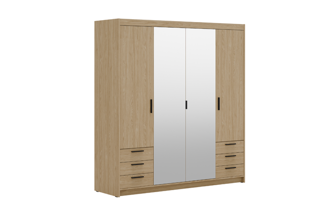 Front z dużym lustrem optycznie powiększa przestrzeń i dodaje wnętrzu lekkości. Dekor w odcieniu dąb olejowanym w połączeniu z czarnymi uchwytami nadaje meblowi elegancki i ponadczasowy charakter – idealny do wnętrz loftowych, klasycznych i nowoczesnych.